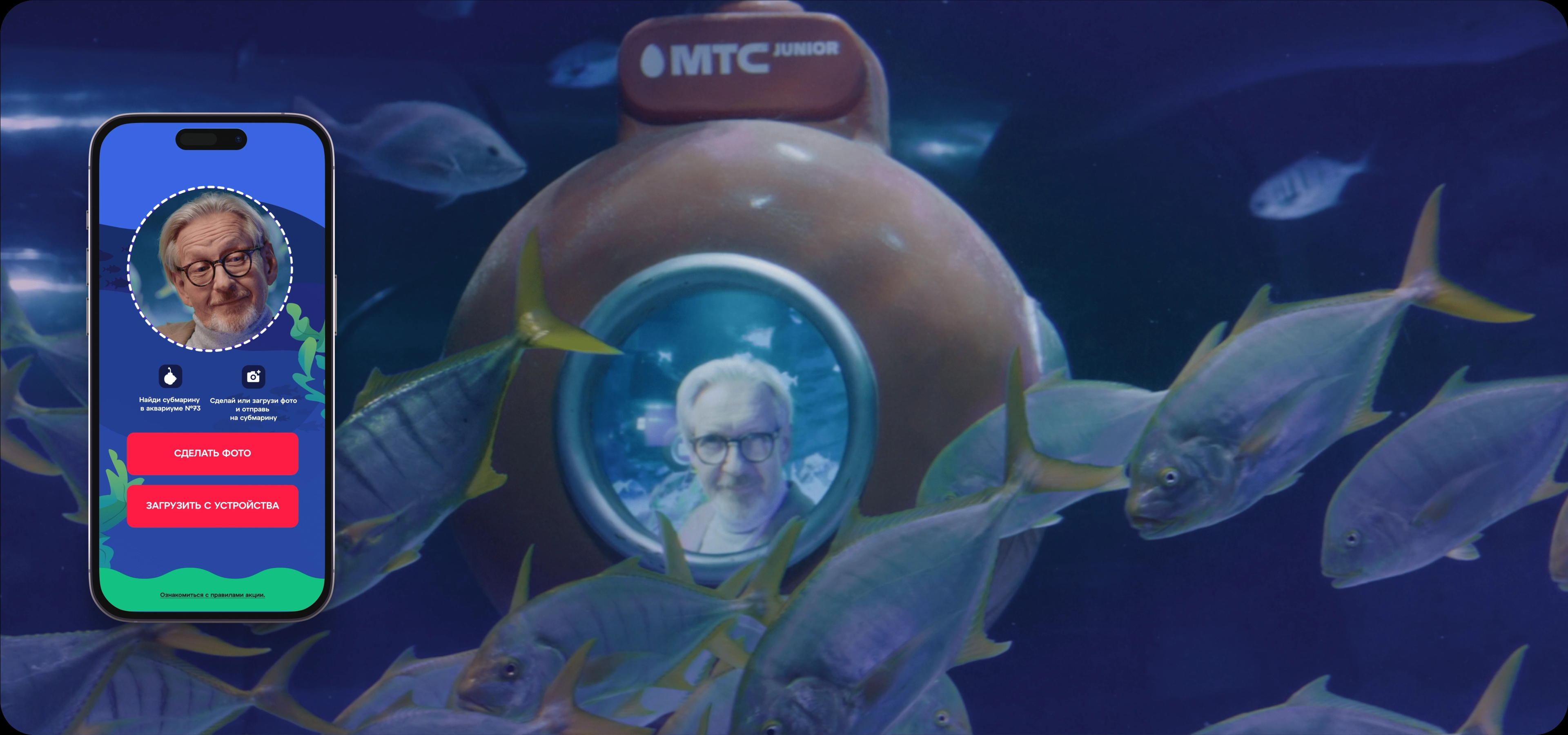 В одном из аквариумов была погружена подводная лодка с водонепроницаемым экраном, на который можно было отправить свое фото через сайт проекта.