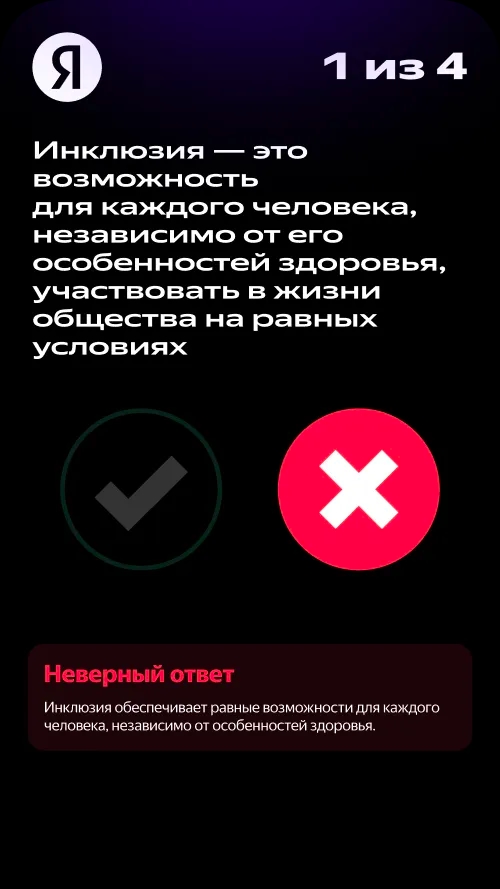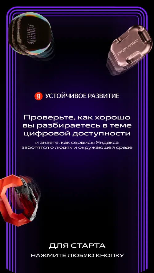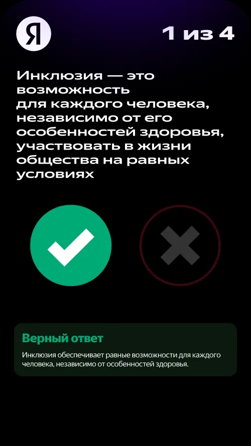Задача участника заключалась в том, чтобы определить правильность утверждений, нажимая соответствующую кнопку. Такой формат вовлекал пользователей в игровой процесс, позволяя в лёгкой и понятной форме узнать больше о том, как сервисы Яндекса внедряют доступные технологии и заботятся о людях и окружающей среде.